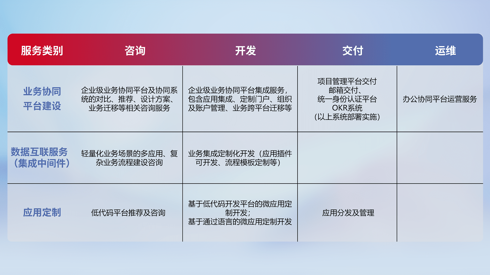 针对钉钉、、、、企微、、、、IDaas等平台级产品提供产品的规划、、方案、、交付、、、、定制化开发等服务,,实现如统一协同办公、、、智能客户服务、、混合会议管理、、、、智能数据查询、、等业务场景,,,实现数字化转型。。