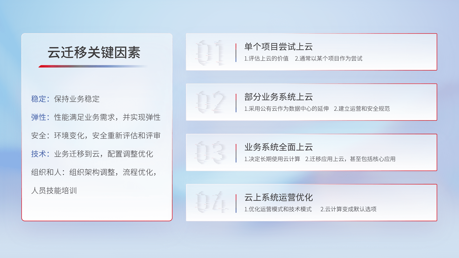 结合实际业务,,,,从规划设计、、、云平台选型、、、云原生改造、、、、数据迁移、、、、集成交付,,迁移全过程为客户识别最佳上云路径,,,做好风险识别管理,,设计网络架构、、、身份权限、、安全审计合规、、操作审计、、、日志审计、、、监控告警策略、、、多站点容灾设计等,,对云上基础设施进行整体规划,,提升IT治理水平,,,,以满足弹性、、、高可用、、高性能的需求。。